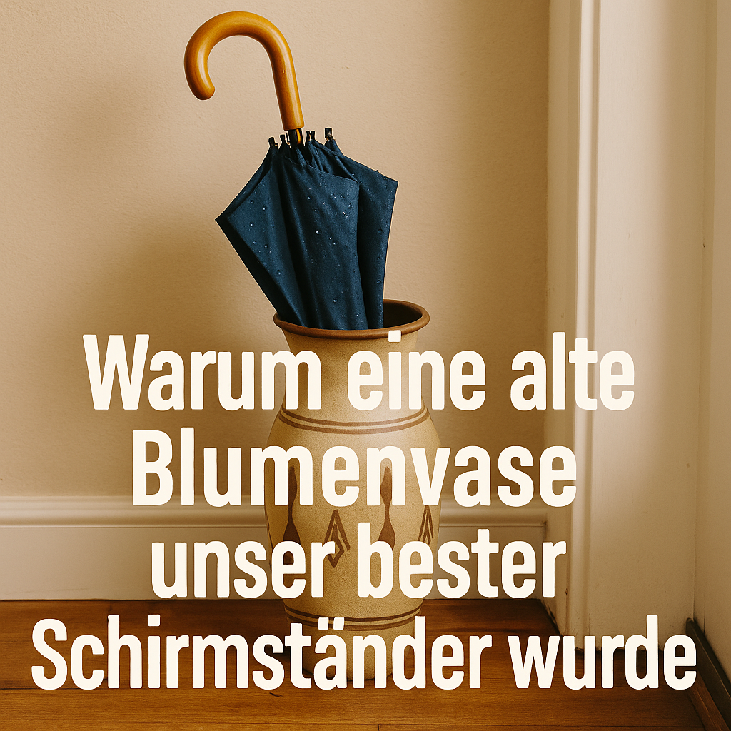 Markus kam hoch, die Vase in der Hand, und sagte: „Was meinst du, könnte das als Schirmständer funktionieren?" Ich war skeptisch. Eine Blumenvase als Schirmständer? Aber dann überlegten wir: Sie ist hoch genug, dass der Schirm nicht umfällt. Sie ist unten breit genug, dass sie stabil steht. Und sie ist wasserdicht – schließlich ist sie für Blumen gedacht. Warum also nicht?