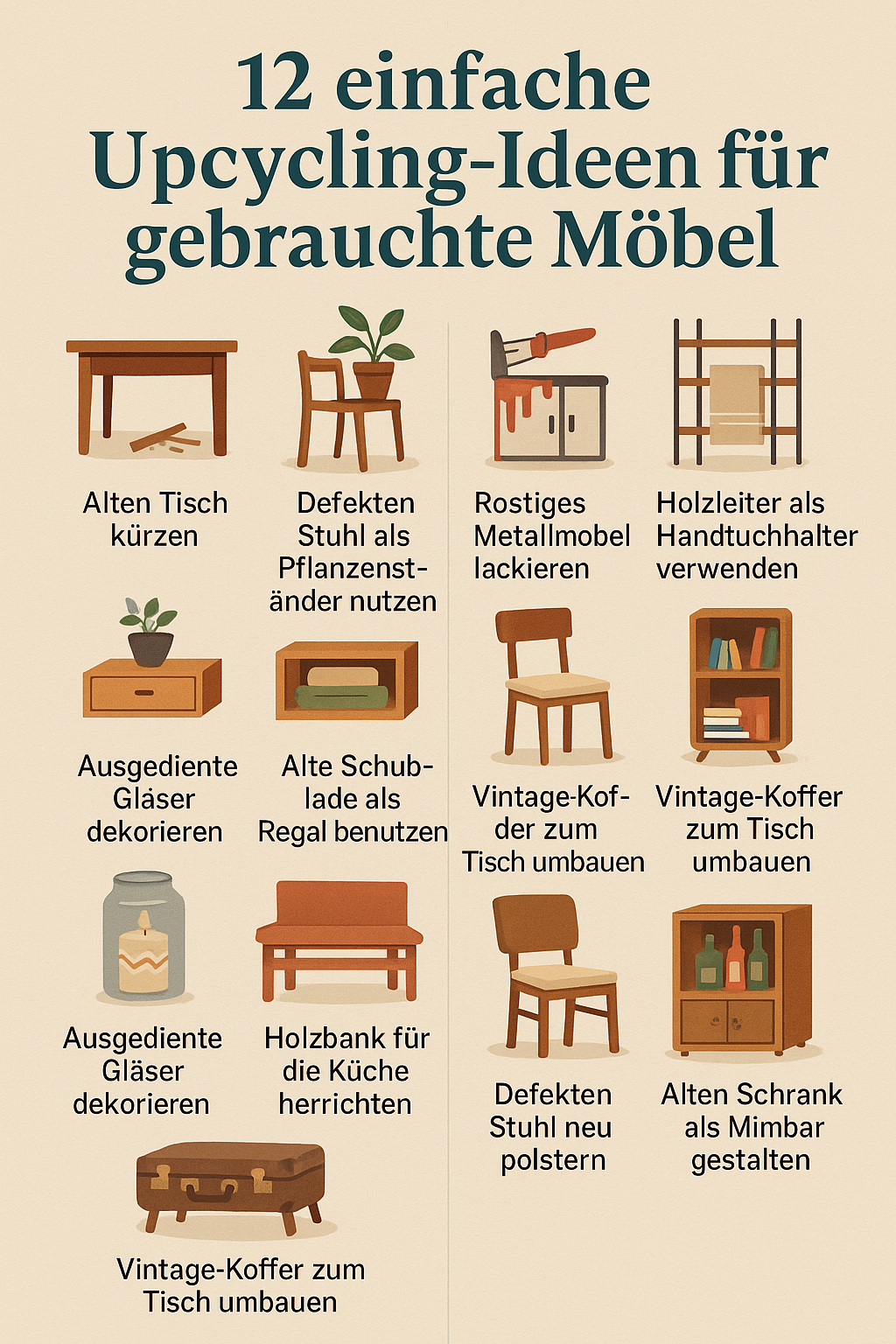 Was wir schnell gelernt haben: Nicht jedes Material eignet sich gleich gut fürs Upcycling. Spanplatten mit Kunststoffbeschichtung sind schwierig zu bearbeiten – die Beschichtung muss komplett runter, sonst haftet keine Farbe. Sperrholz splittert leicht beim Sägen. Massivholz ist ideal, aber auch alte Metallmöbel lassen sich gut aufarbeiten. Wir haben einen rostigen Zeitungsständer mit Rostumwandler behandelt und dann mit Hammerschlaglack neu lackiert. Sieht jetzt aus wie ein Designer-Stück und steht im Wohnzimmer.